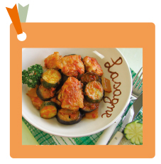 鶏肉は一口大に切り、玉ねぎは2cm位の色紙切り、ナス・ズッキーニは1cm位の輪切りにする。
