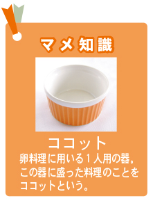 ココット型に①・②・③・④を入れて200℃のオーブンで約15分、表面に焼き色がつくまで焼く。