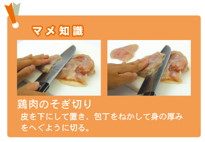 - 鶏肉はそぎ切りにし、調味料に漬ける。(約20分)