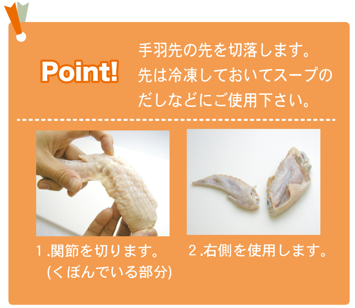 手羽先は関節部分に包丁を入れて切落し、皮目に切り込みを入れる。