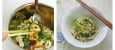 水菜は熱湯でさっとゆでて冷水に取り、水気を絞って3~4cmの長さに切る。
